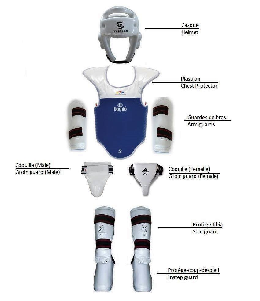 Full Set – Protective Gear Taekwondo – Included: Helmet, Chest Guard, Arm Guards, Shin Guards and Foot Guard, Jock Strap. (*Mandatory for Yellow belt and up)